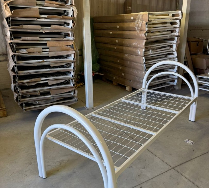 Кровать одноярусная 80х190 , форма спинки двойной полукруг - Пп образная , каркас имеет двойное усиление, 50х100 клетка 3.5 мм толщина сетки . Кровати покрашены белой порошковой краской и идут в заводских картонных упаковках
