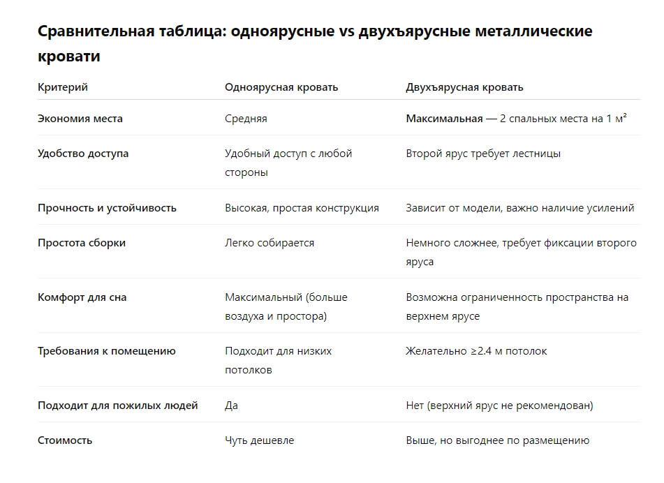 Выбор между одноярусной и двухъярусной металлической кроватью - это не только про комфорт, но и про грамотную организацию пространства. Чем чётче вы понимаете, для кого и зачем обустраивается помещение, тем проще принять верное решение.